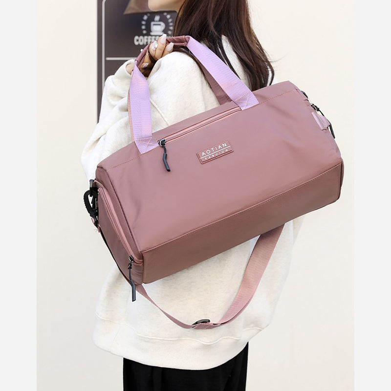 Innenaufteilung: 1 Haupttasche, 1 Innentasche mit Reißverschluss, 2 aufgesetzte Innentaschen, 1 Trenntasche für Nass- und Trockenwäsche, 1 Seitentasche, 1 separates Schuhfach, 1 Fronttasche