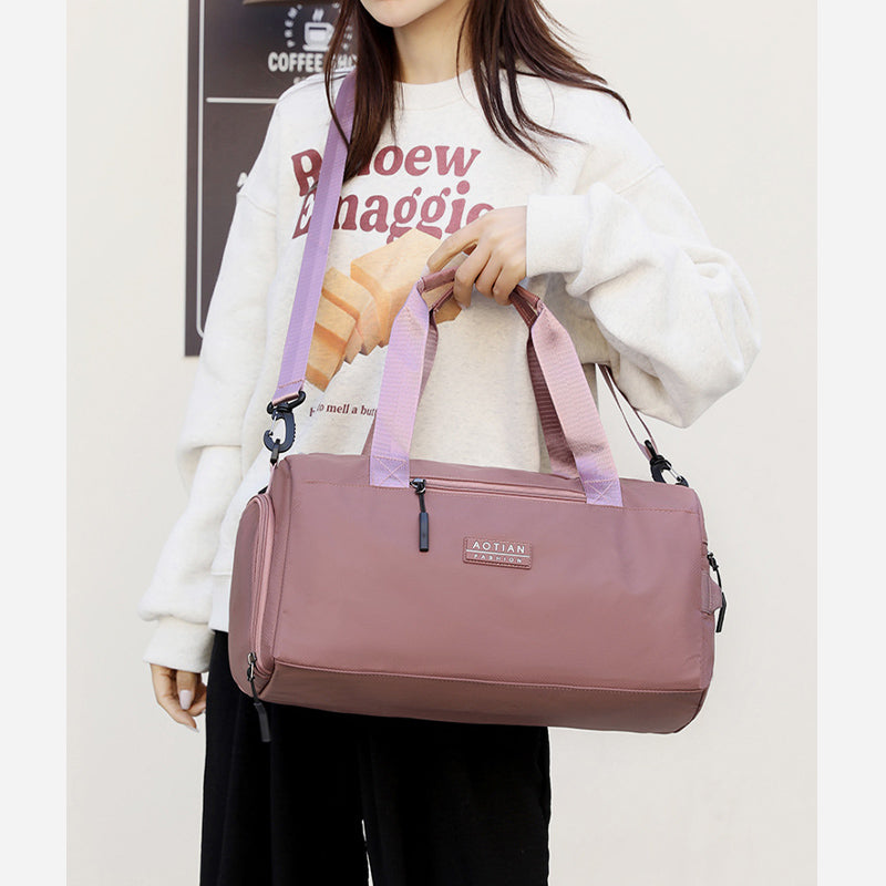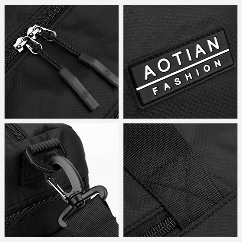 Innenaufteilung: 1 Haupttasche, 1 Innentasche mit Reißverschluss, 2 aufgesetzte Innentaschen, 1 Trenntasche für Nass- und Trockenwäsche, 1 Seitentasche, 1 separates Schuhfach, 1 Fronttasche