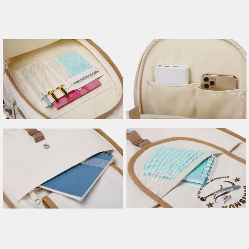 Innenaufteilung: 1 Hauptfach, 1 Innenfach, 2 Innentaschen mit Reißverschluss, 4 aufgesetzte Innentaschen, 3 Stiftfächer, 2 Seitentaschen