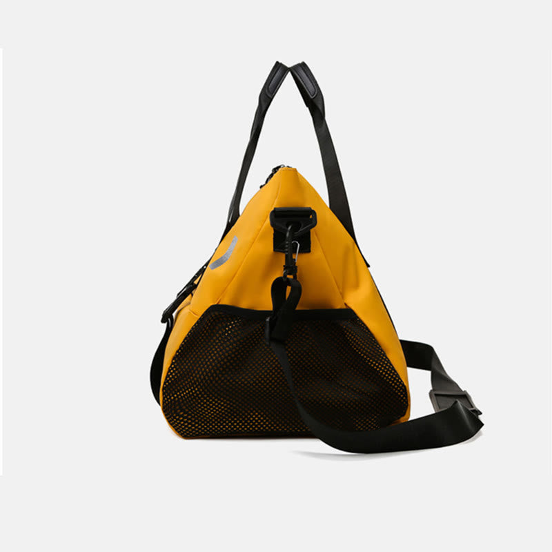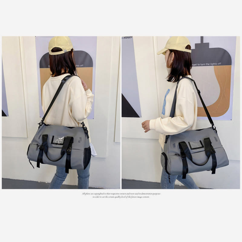 Innenaufteilung: 1 Hauptfach, 1 Innentasche mit Reißverschluss, 2 aufgesetzte Innentaschen, 1 Seitentasche, 1 Trennfach für Trocken- und Nasswäsche, 1 Schuhfach