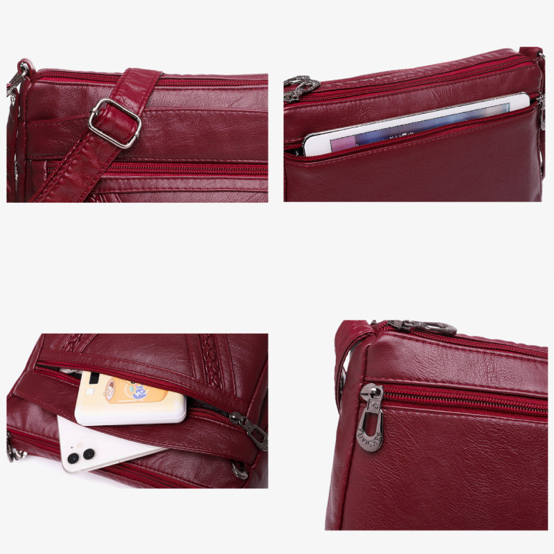 Innenaufteilung: 2 Haupttaschen, 2 Innentaschen mit Reißverschluss, 2 Innenfächer, 2 Vordertaschen, 1 Gesäßtasche