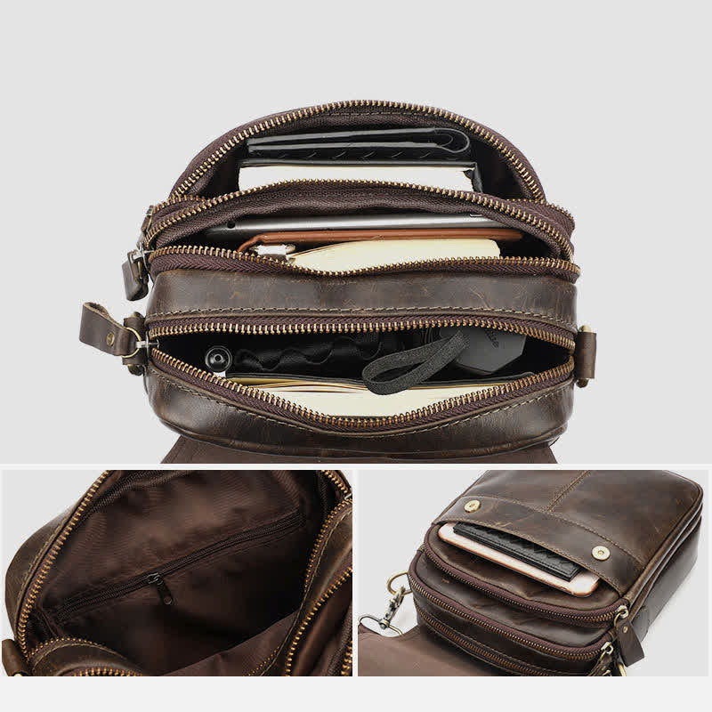 Innenaufteilung: 3 Haupttaschen, 1 Innentasche mit Reißverschluss, 1 Vordertasche, 1 Gesäßtasche
