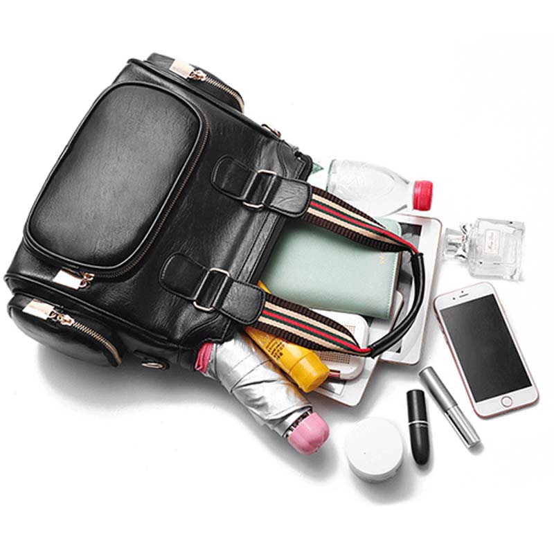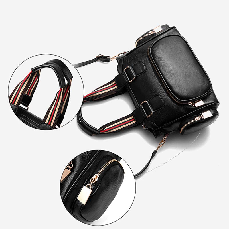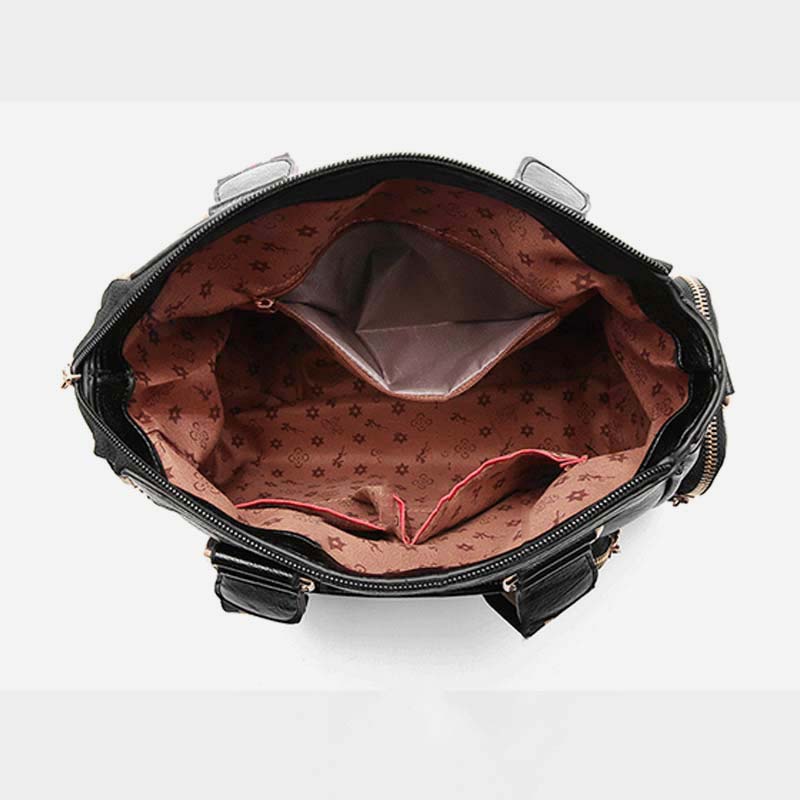 Interne Struktur: 1 Haupttasche, 1 Innentasche mit Reißverschluss, 1 aufgesetzte Innentasche, 2 seitliche Reißverschlusstaschen, 1 Reißverschluss-Fronttasche, 1 Reißverschlusstasche hinten