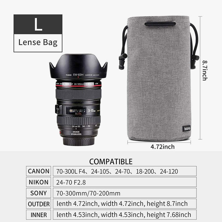 - l: 4,72" × 8,66" /12×22cm, für Objektive mit einer Höhe von <19cm und einem Durchmesser von <11cm, wie zB Canon 24-105, Nikon 24-70 f2.8, Sony 70-300mm/70-200mm