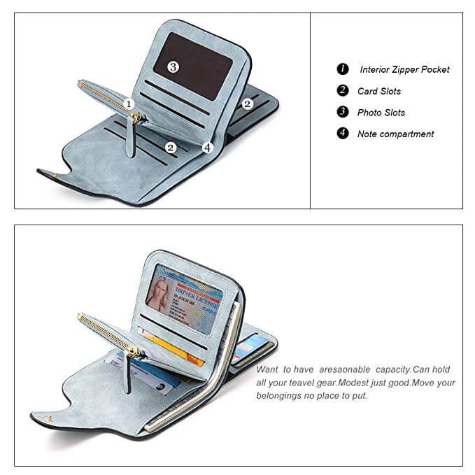 kurz: 7 * Kartenfächer, 1 * transparentes Ausweisfenster, 1 * Bargeldfächer, 1 * innerer Reißverschluss