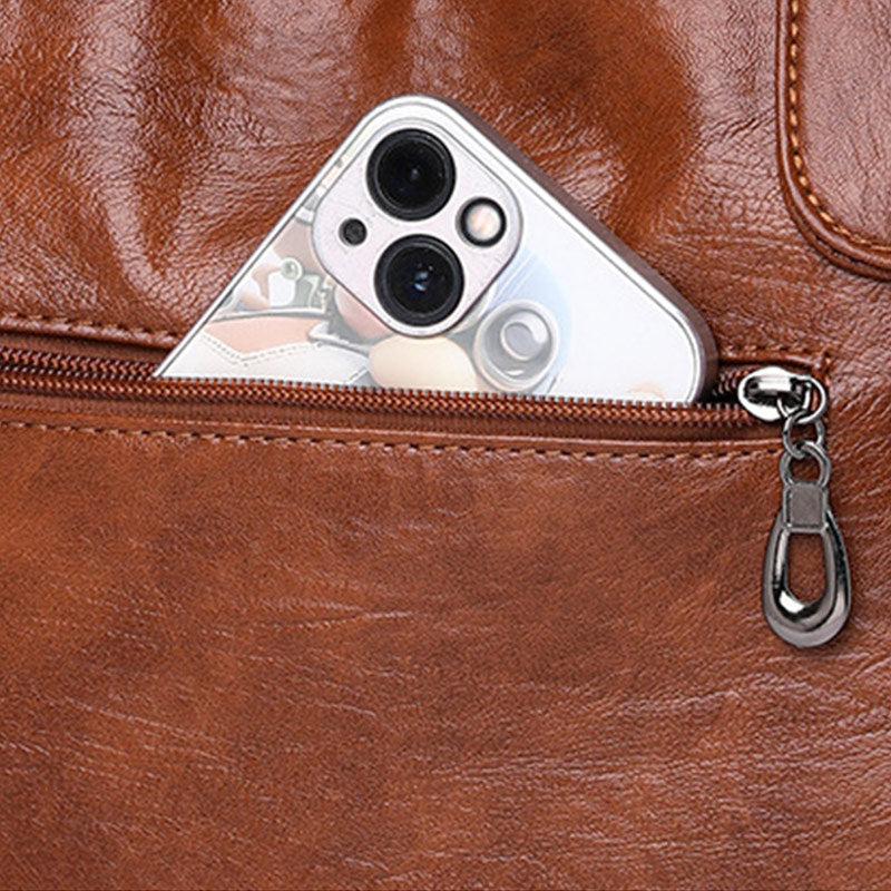 Innenaufteilung: 1 Haupttasche, 2 Innenfächer, 2 Innentaschen mit Reißverschluss, 1 aufgesetzte Innentasche, 1 Fronttasche, 1 Gesäßtasche