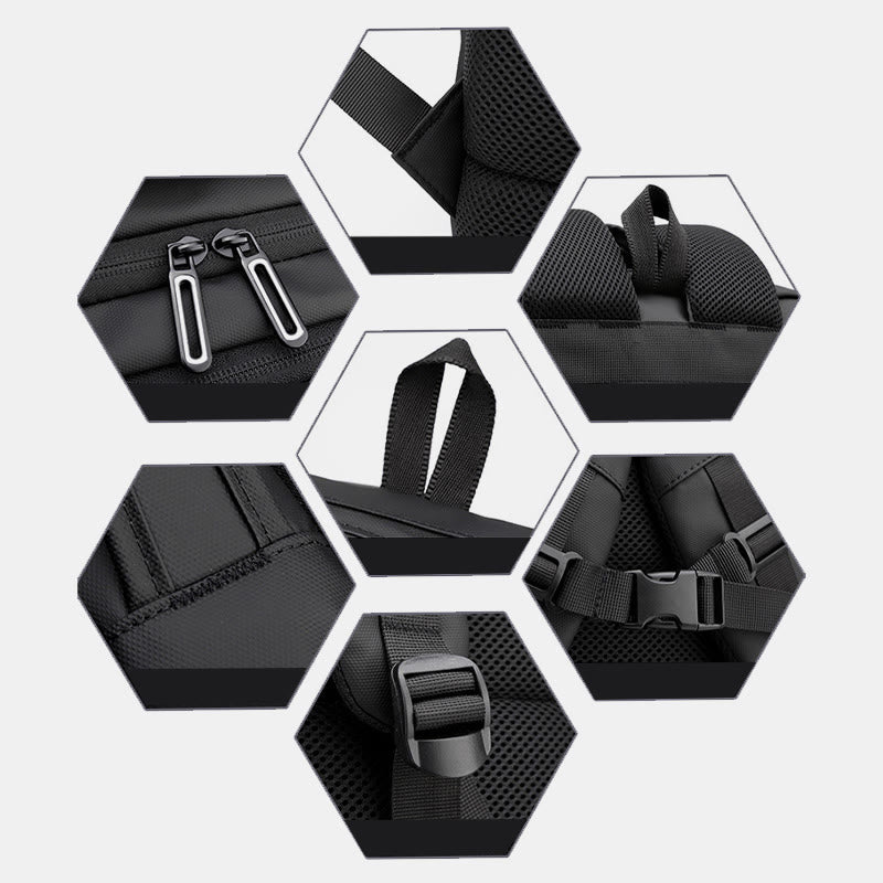 Innenaufteilung: 2 Hauptfächer, 3 Innenfächer, 2 Stiftfächer, 2 Vordertaschen, 1 Gesäßtasche