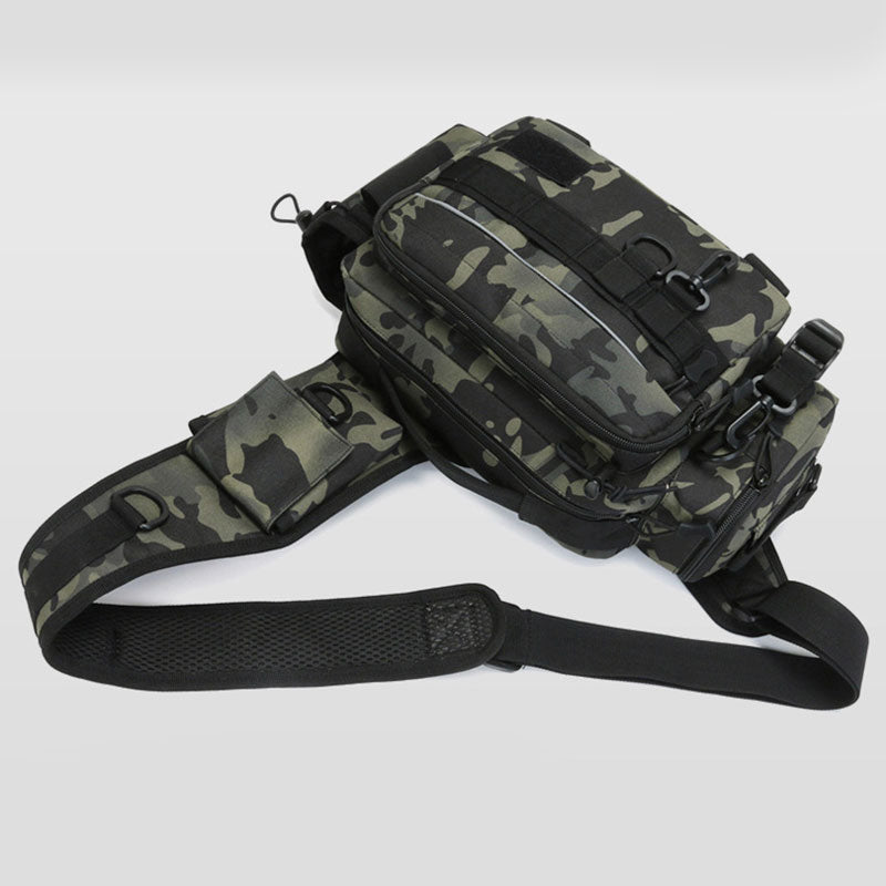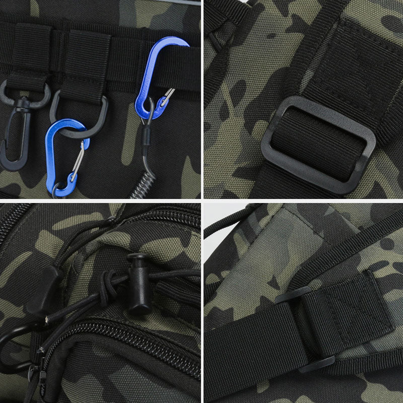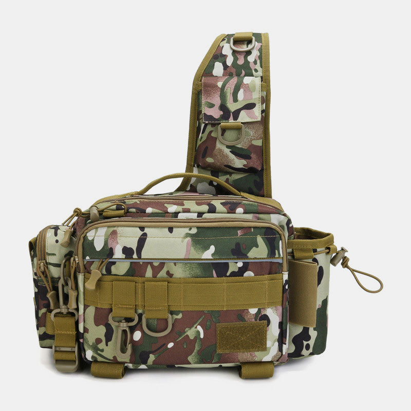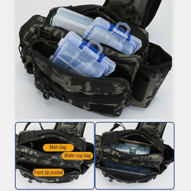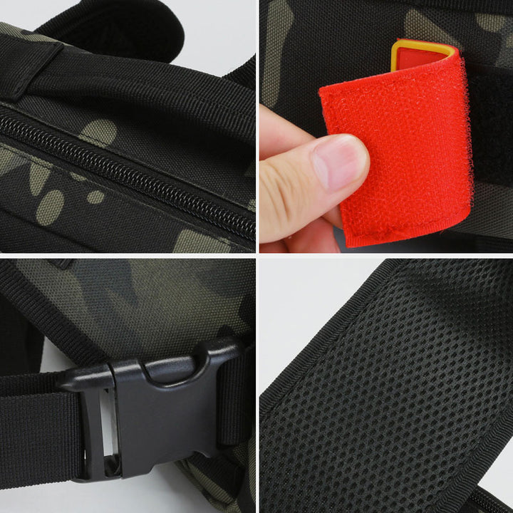 Innenaufteilung: 1 Haupttasche, 1 Innentasche mit Reißverschluss, 1 Fronttasche mit Reißverschluss, 1 Flaschenfach, 1 Seitentasche, 1 Gesäßtasche