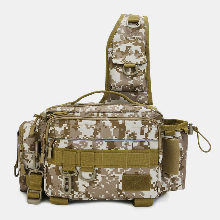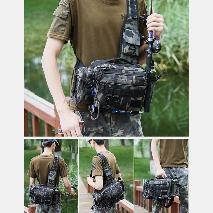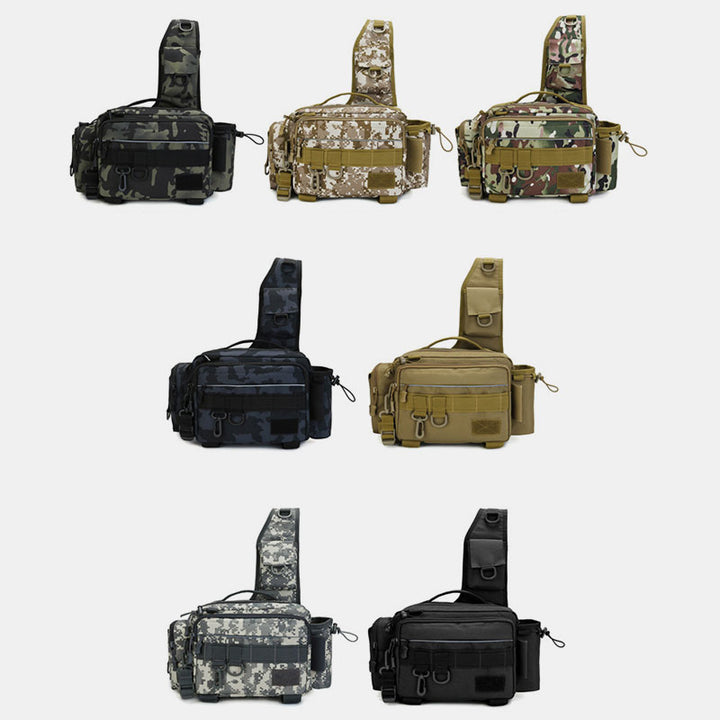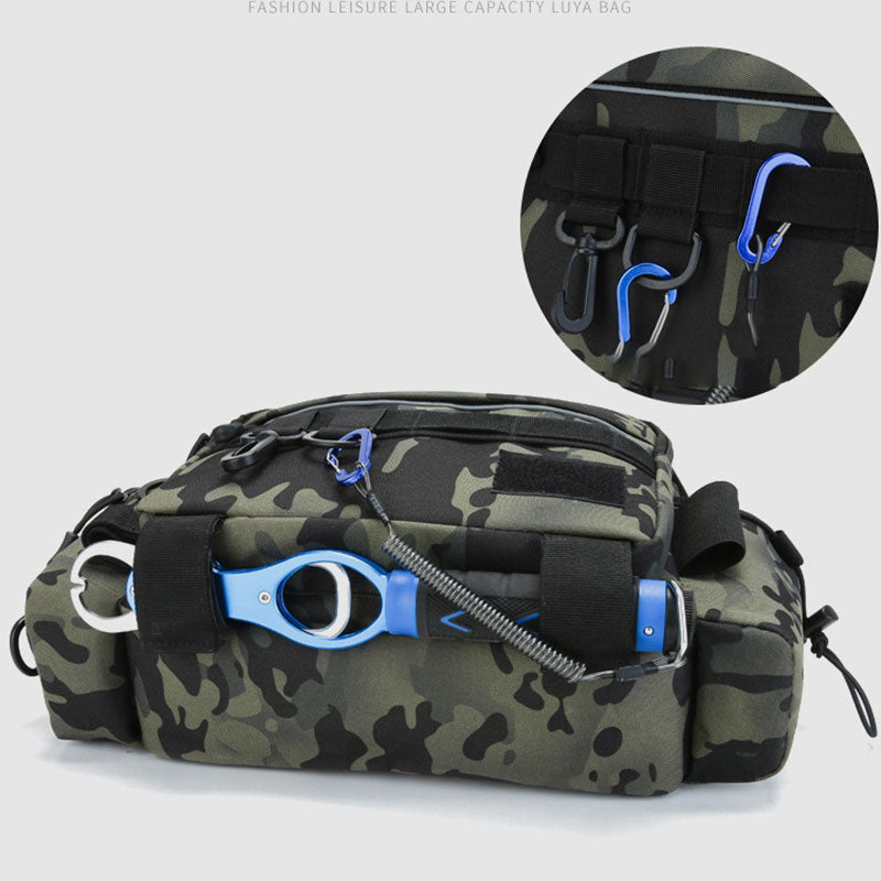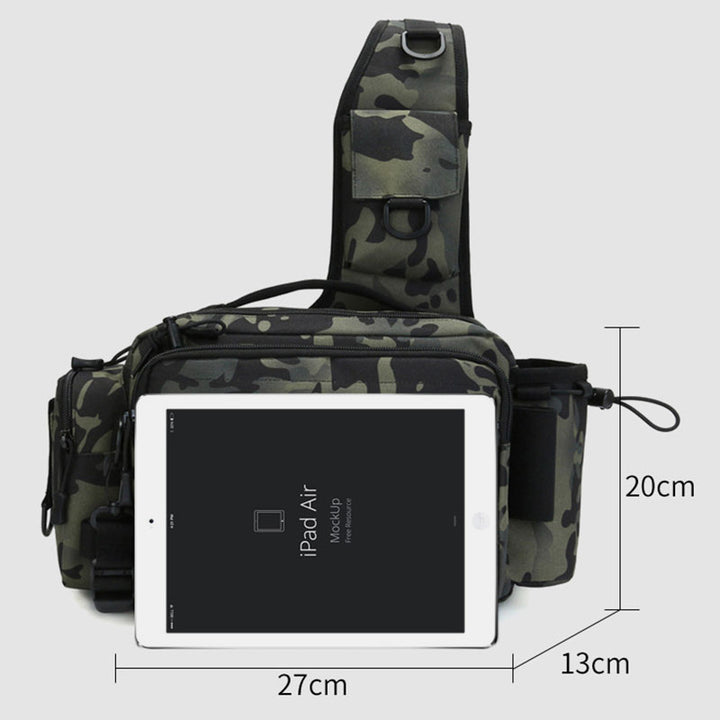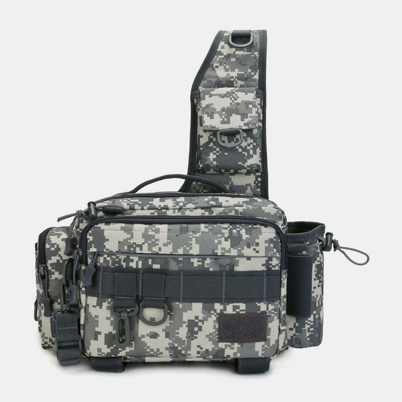 Innenaufteilung: 1 Haupttasche, 1 Innentasche mit Reißverschluss, 1 Fronttasche mit Reißverschluss, 1 Flaschenfach, 1 Seitentasche, 1 Gesäßtasche