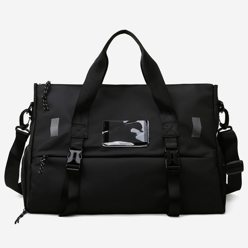 Innenaufteilung: 1 Hauptfach, 1 Innentasche mit Reißverschluss, 2 aufgesetzte Innentaschen, 1 Seitentasche, 1 Trennfach für Trocken- und Nasswäsche, 1 Schuhfach