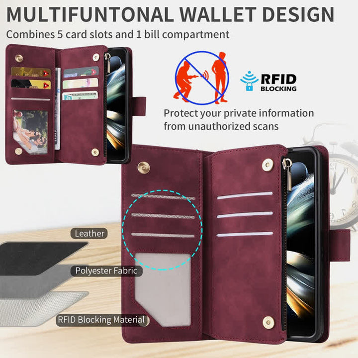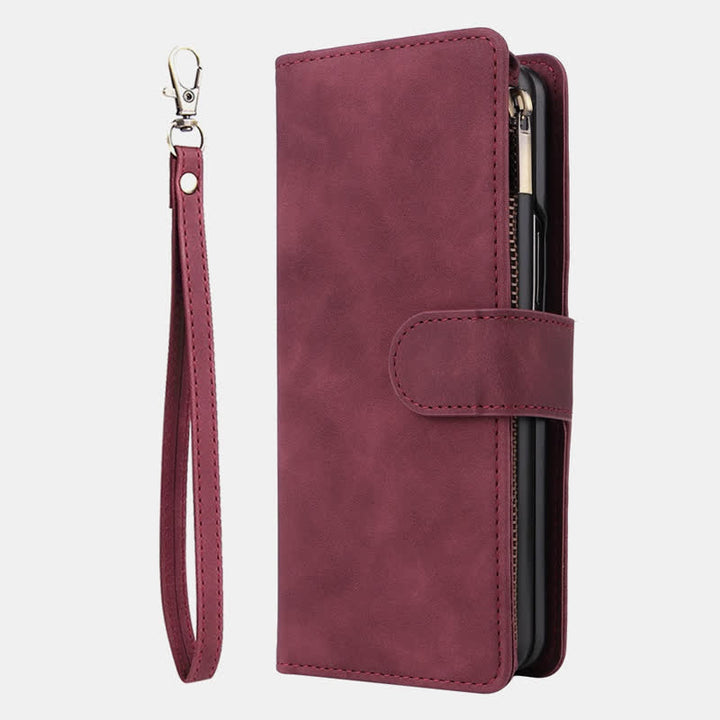 Interne Struktur: Telefonhülle, 5 Kartenfächer, 1 Fotofach, 1 Geldscheinfach, 1 Reißverschlussfach