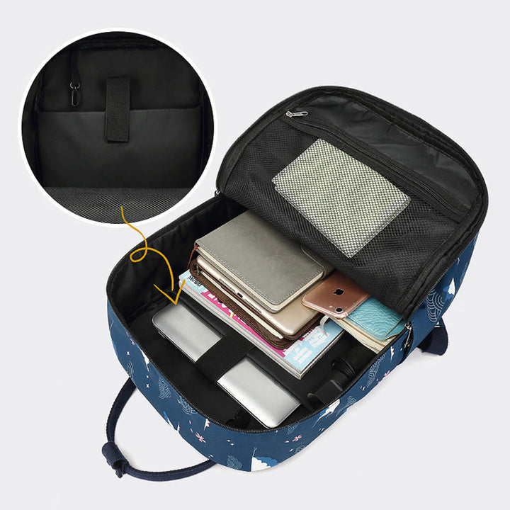 Innenaufteilung: 1 Hauptfach, 1 Innenfach, 1 Innentasche mit Reißverschluss, 2 Seitentaschen, 1 Gesäßtasche, 1 Vordertasche