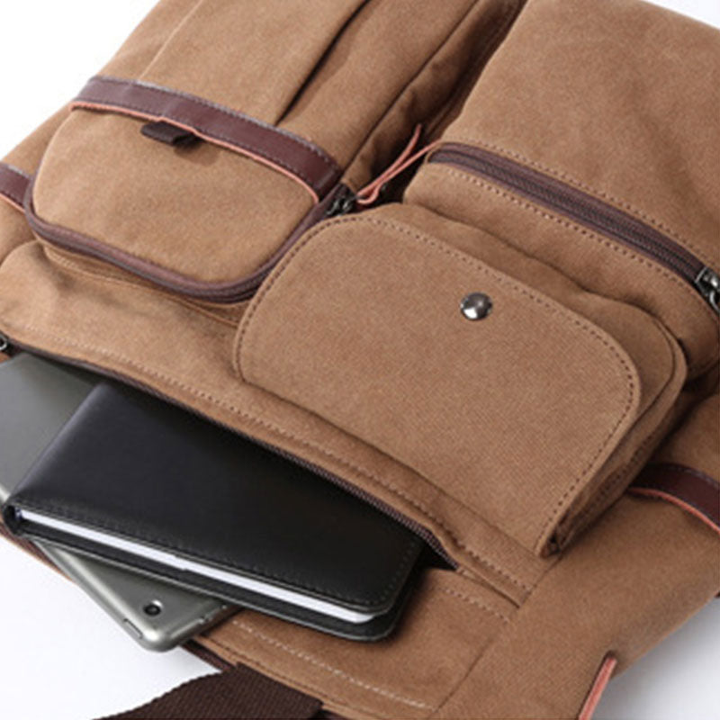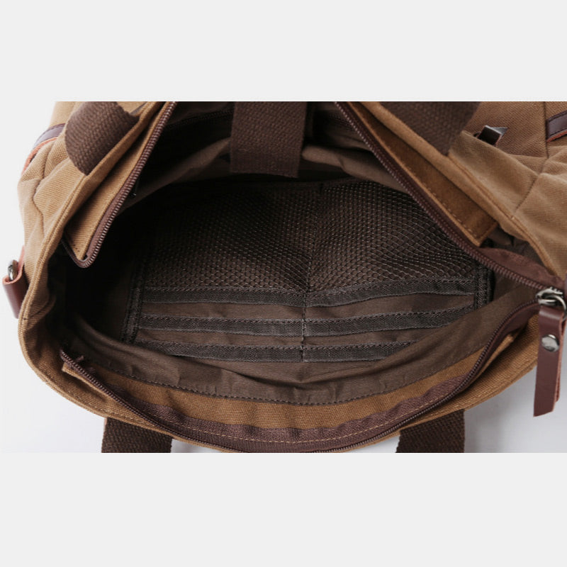 Innenaufteilung: Hauptfach mit Reißverschluss, Laptopfach, Innenfach, Seitentasche, Reißverschlusstaschen vorn, Schnallentasche vorn, Reißverschlusstasche hinten