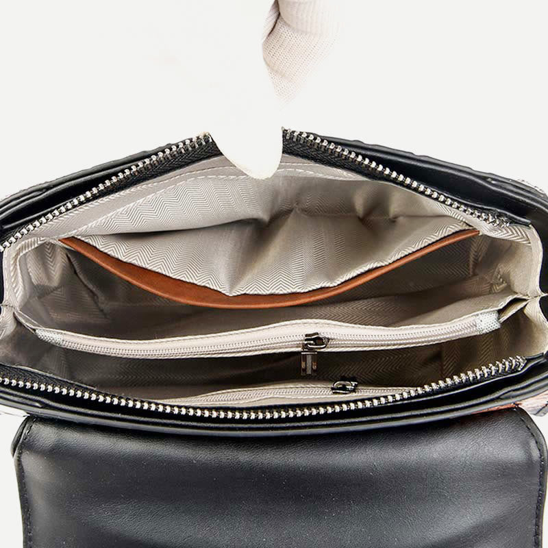 Innenaufteilung: 1 Haupttasche, 2 Innentaschen mit Reißverschluss, 1 aufgesetzte Innentasche, 1 Gesäßtasche