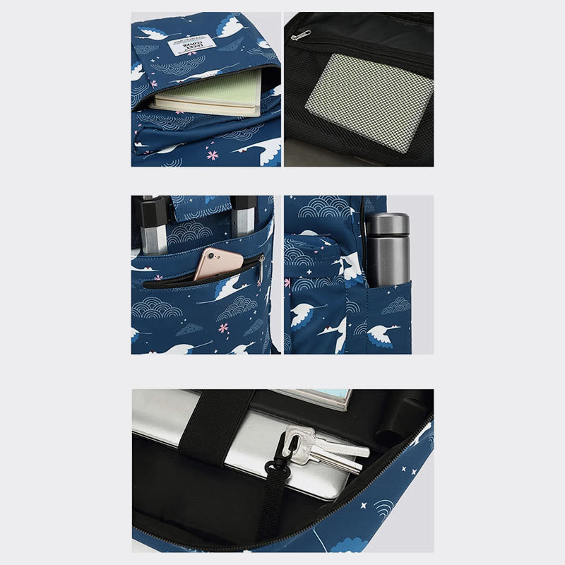 Innenaufteilung: 1 Hauptfach, 1 Innenfach, 1 Innentasche mit Reißverschluss, 2 Seitentaschen, 1 Gesäßtasche, 1 Vordertasche