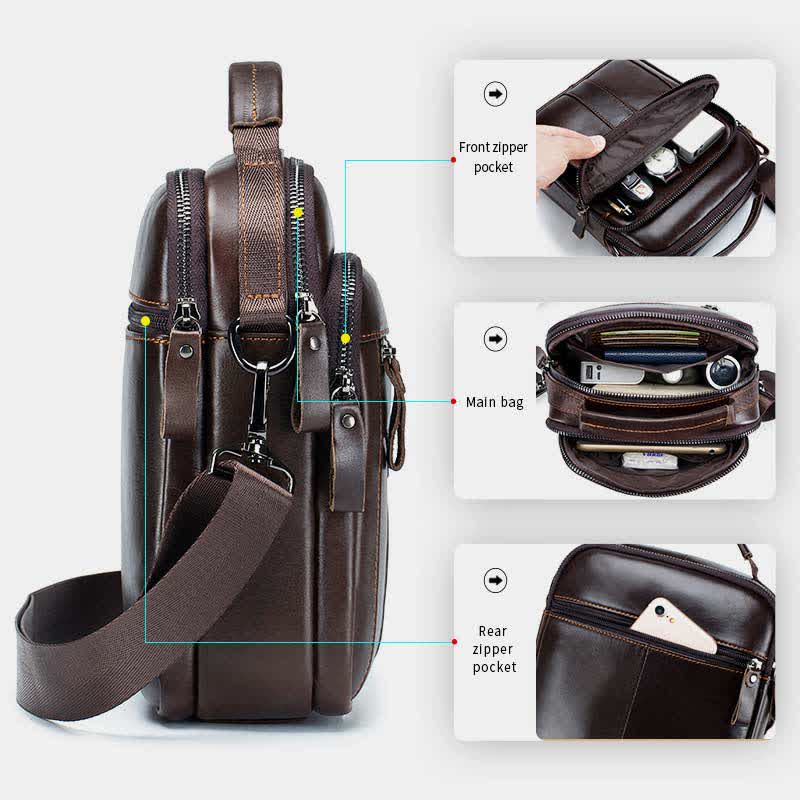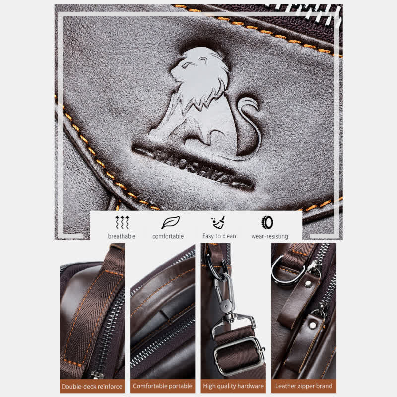 Interne Struktur: 2 Haupttaschen, 1 Innentasche mit Reißverschluss, 1 aufgesetzte Innentasche, 3 Kartenfächer, 2 Vordertaschen, 1 Gesäßtasche