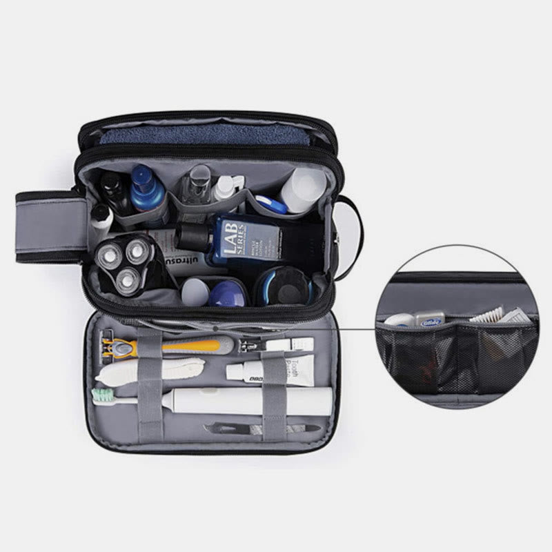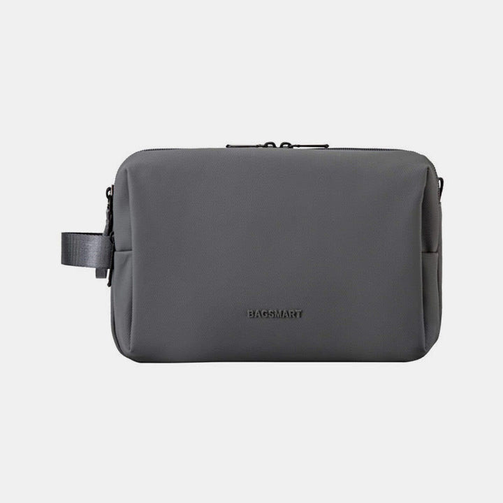 Innenaufteilung: 2 Haupttaschen, 1 Innentasche mit Reißverschluss, 6 aufgesetzte Innentaschen, 1 Trenntasche für Nass- und Trockentaschen