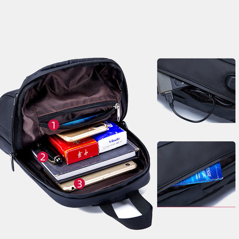 Innenstruktur: 1 Hauptfach, 1 Innenfach für Tablets, 1 Innere Reißverschlusstasche, 1 Front-Flaschenhalter, 2 Seitentaschen mit Reißverschluss