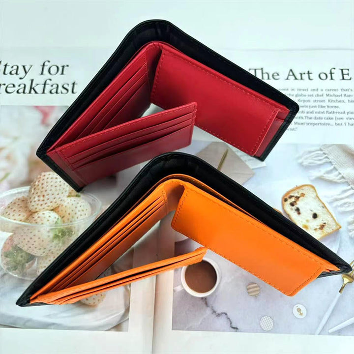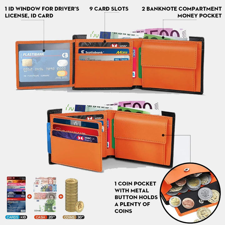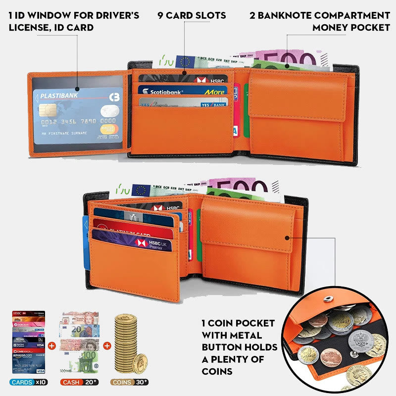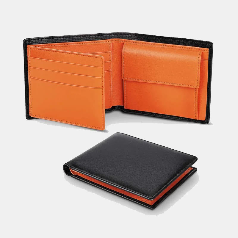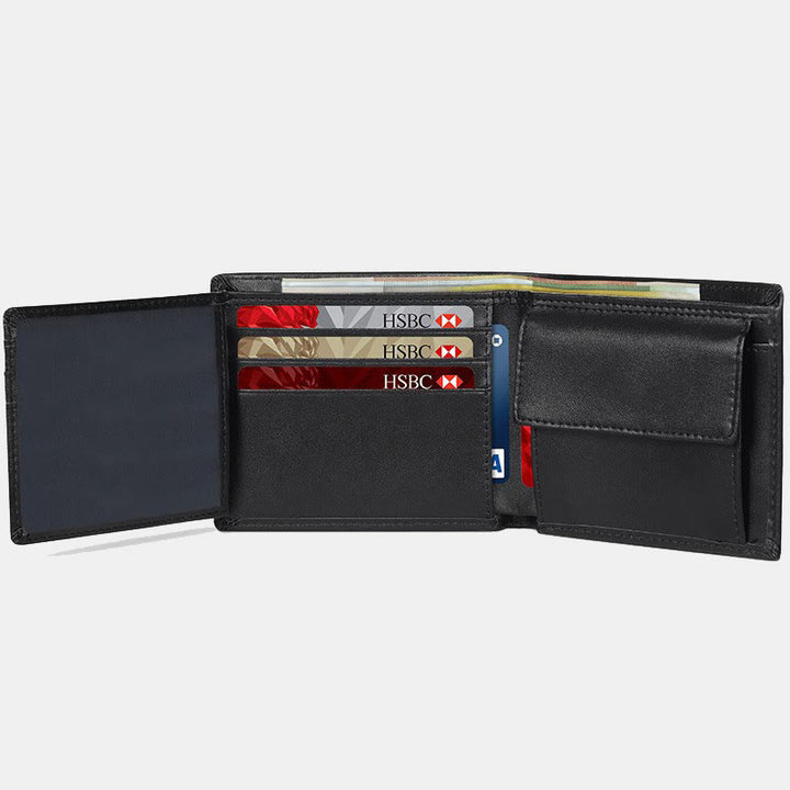 Dreifach gefaltete, schmale Lederbrieftasche mit RFID-Blockierung für Herren mit Münzfach