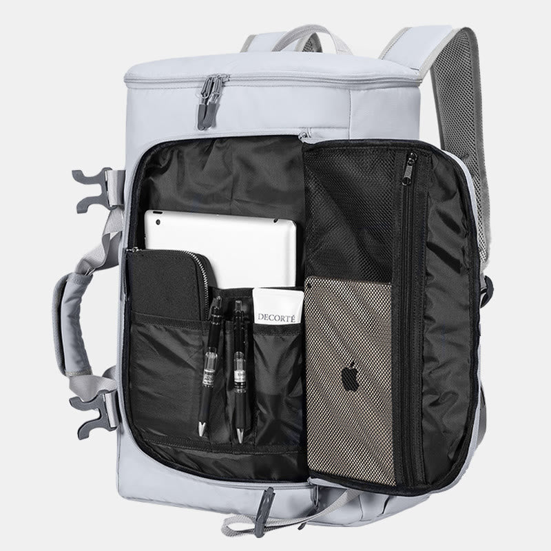 Interne Struktur: 1 Haupttasche, 1 Fronttasche mit mehreren Fächern, 1 Reißverschlusstasche oben, 1 Reißverschlusstasche hinten, 2 Seitentaschen, 1 oberes Fach