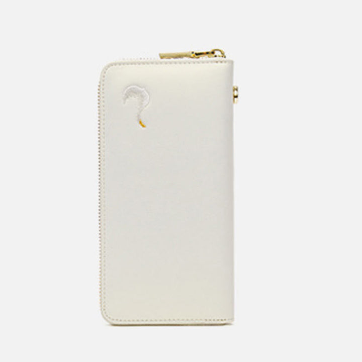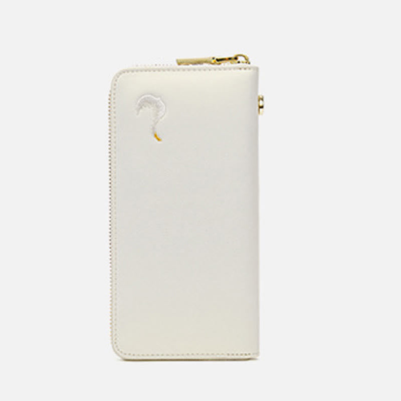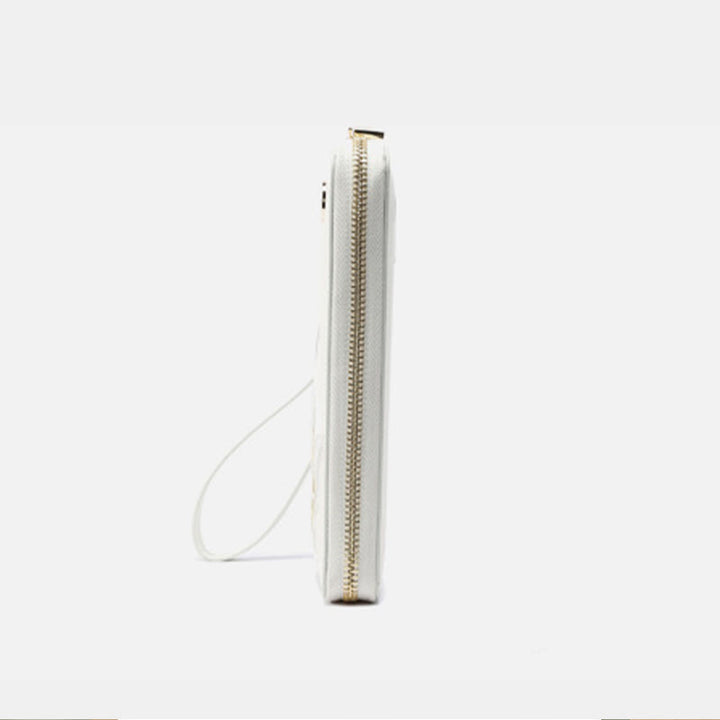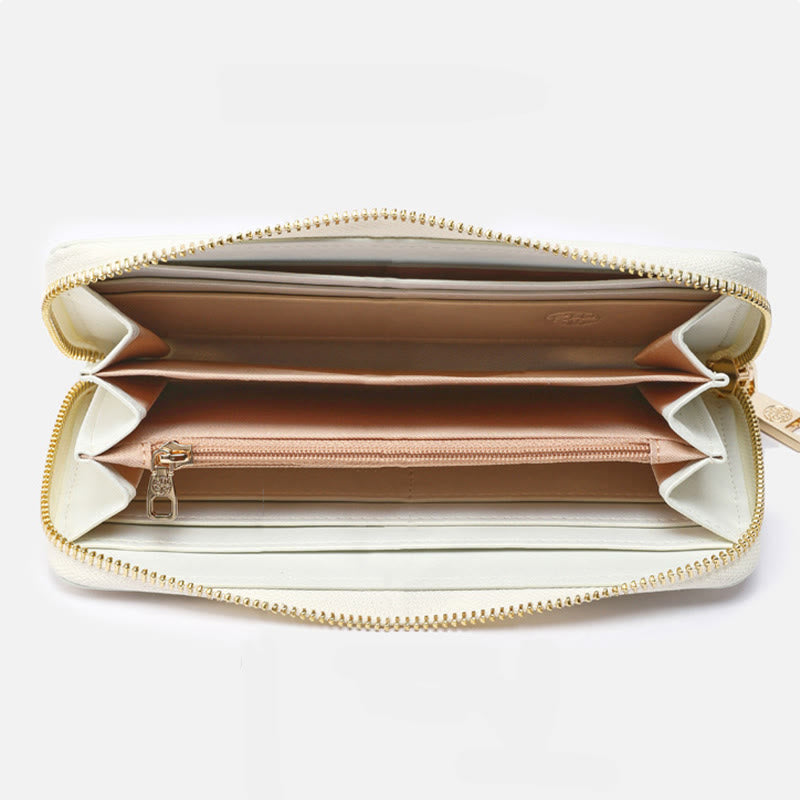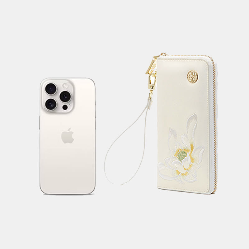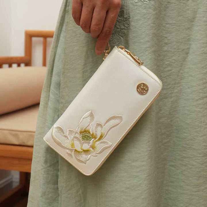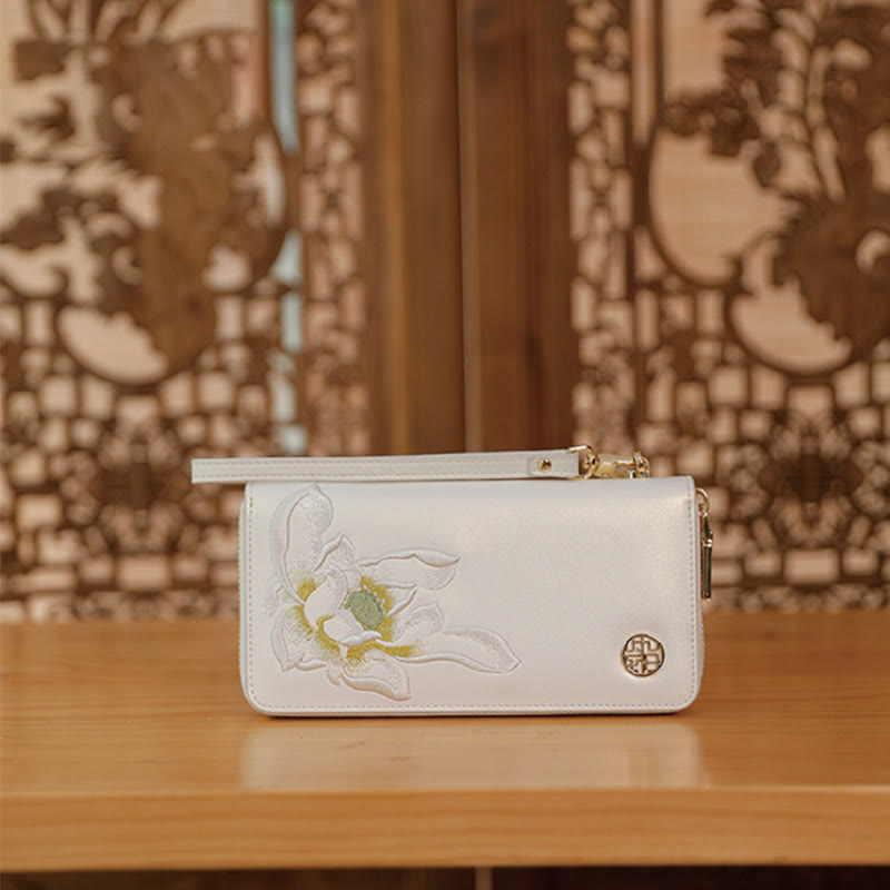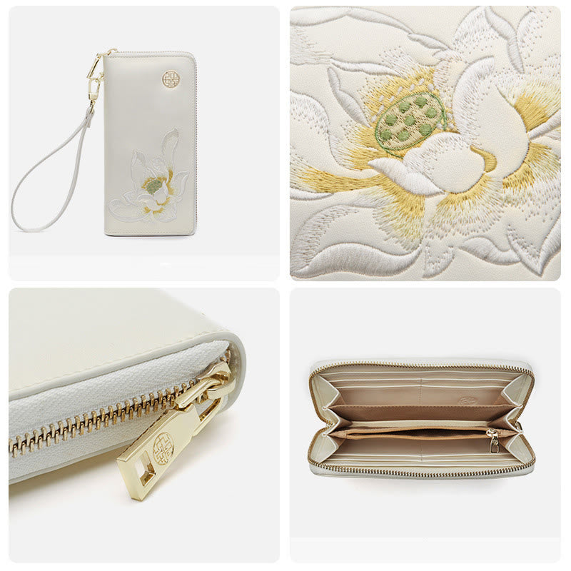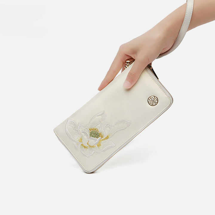 Geldbörse aus echtem Leder mit Lotus-Stickerei und Rundum-Reißverschluss, Clutch, Armbandtasche