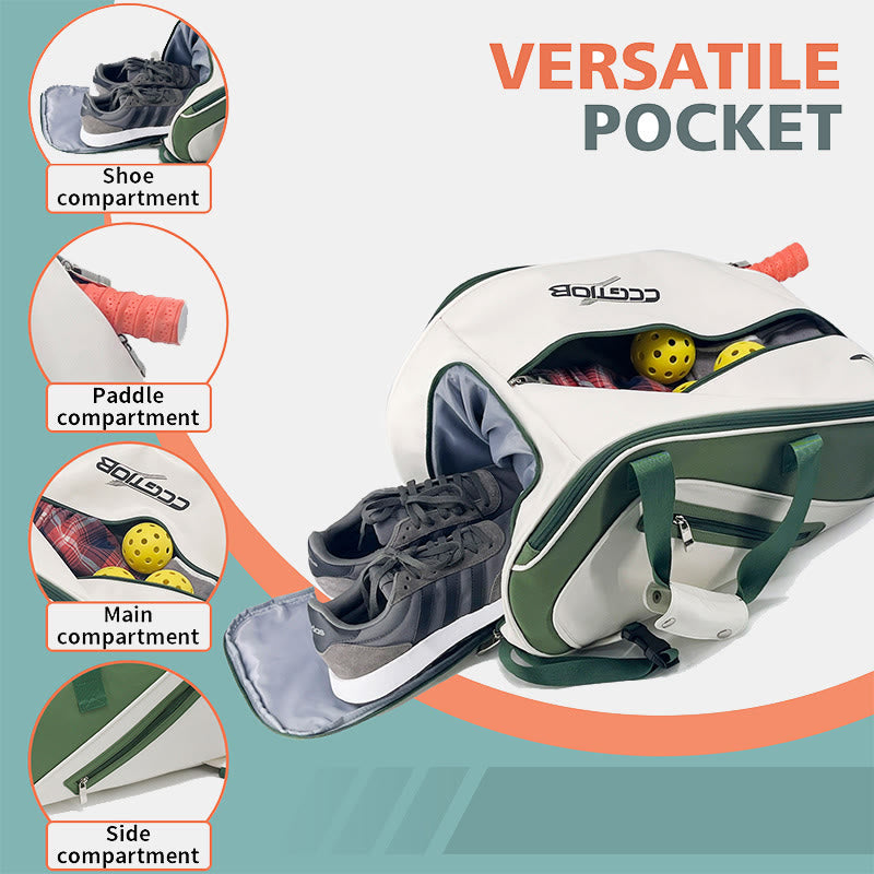 Interne Struktur: 1 Haupttasche, 1 Schlägerhüllentasche, 1 Seitentasche, 1 unteres Schuhfach
