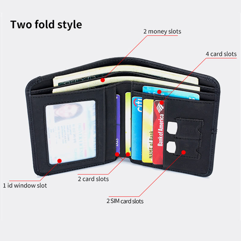 - Bifold-Stil: 2 Geldscheinfächer, 6 Kartenfächer, 1 Fotofach, 2 SIM-Fächer