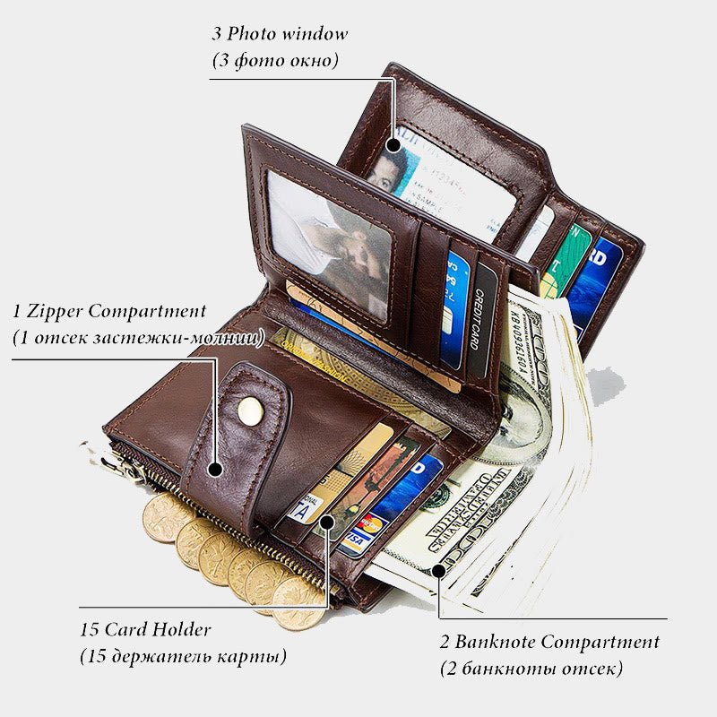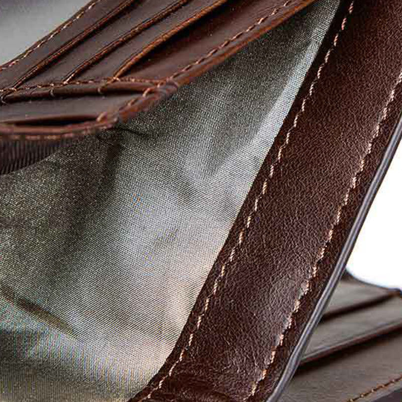 Interne Struktur: 15 Kartensteckplätze, 3 Fotosteckplätze, 1 Münzfach mit Reißverschluss, 2 Bargeldfächer