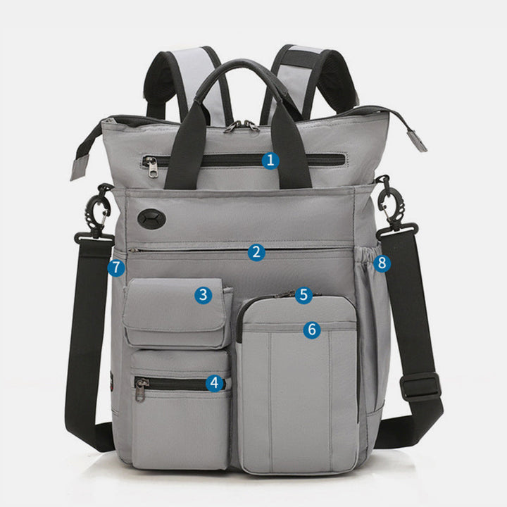 Innenaufteilung: Hauptfach, Laptopfach, laminiertes Reißverschlussfach, Frontfach, Fronttaschen mit Reißverschluss, 2 Seitentaschen