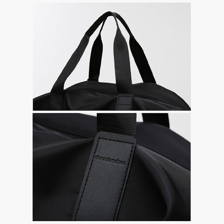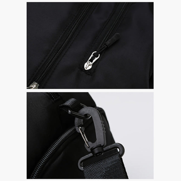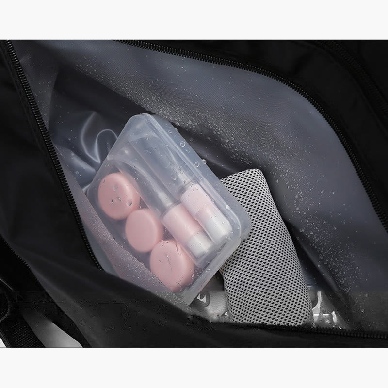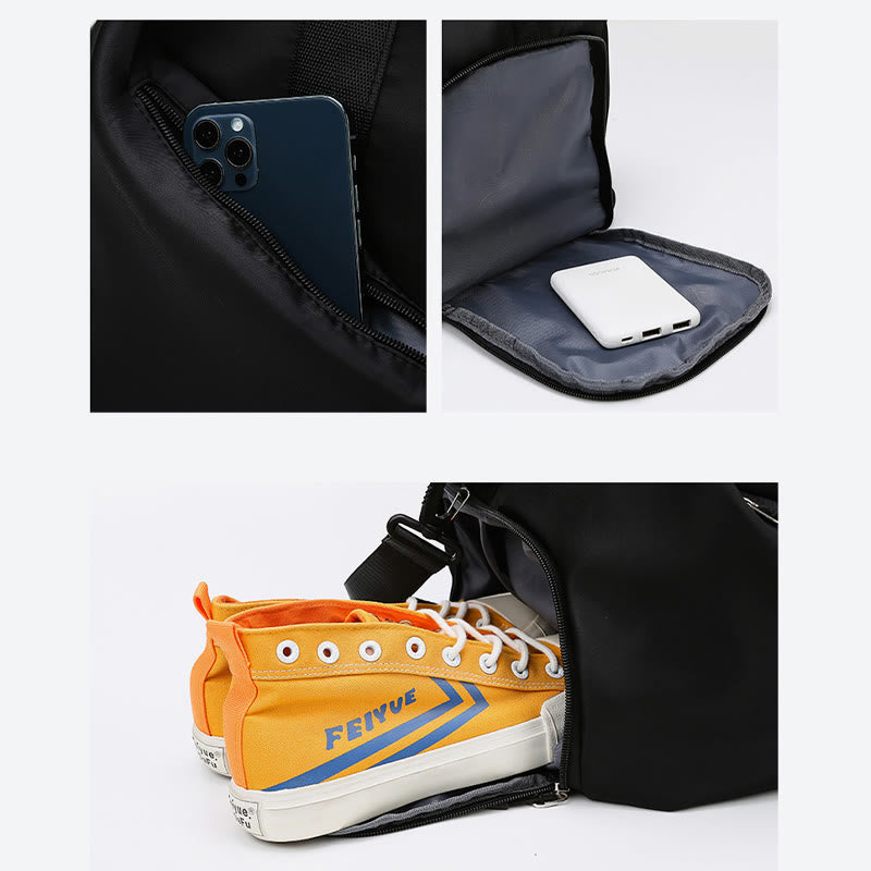 Innenaufteilung: 1 Haupttasche, 1 Trocken-/Nasstrenntasche, 2 Seitentaschen, 1 Fronttasche