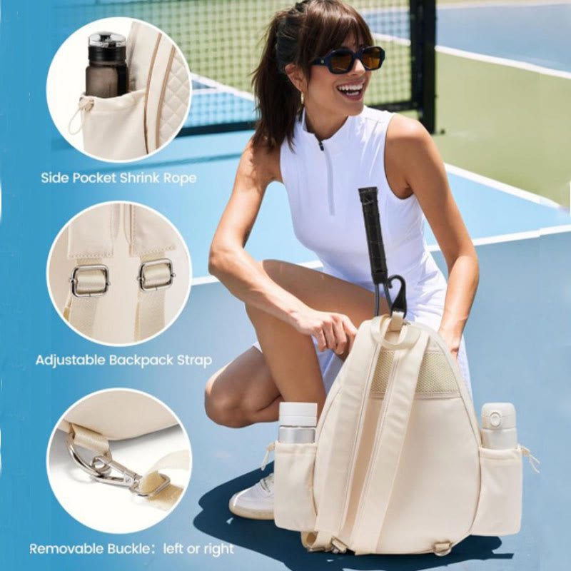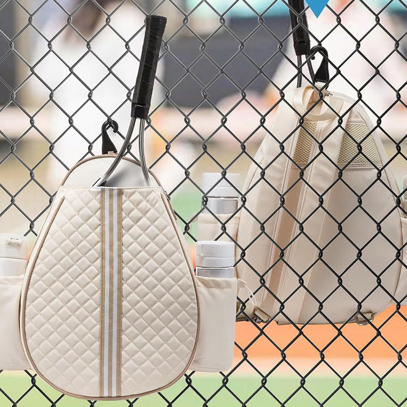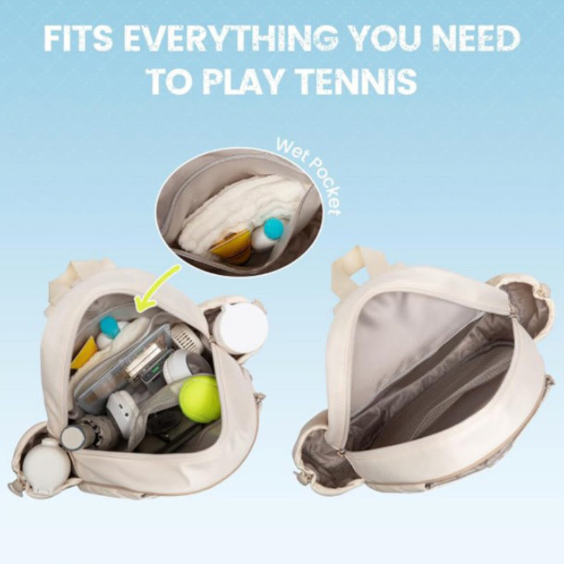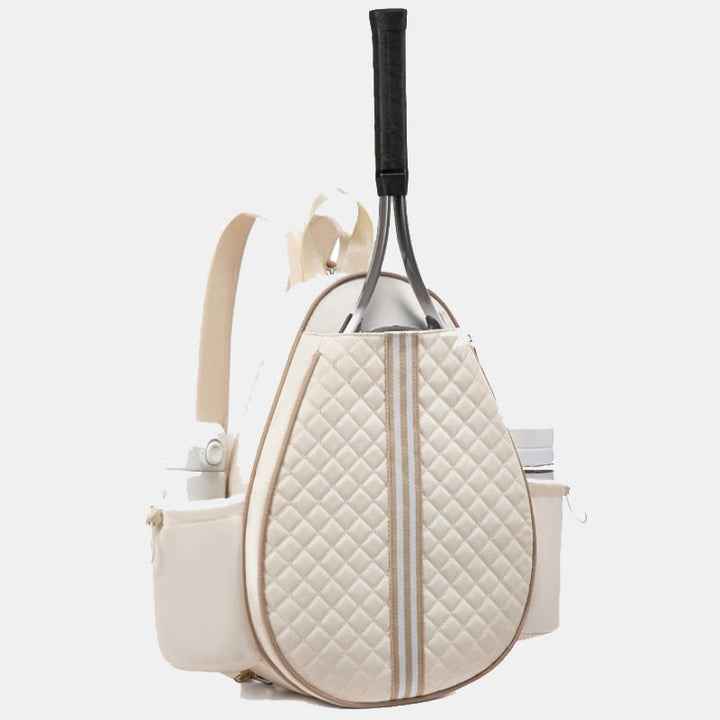 Interne Struktur: 1 Haupttasche, 1 aufgesetzte Innentasche, 1 Innentasche mit Reißverschluss, 2 Seitentaschen, 1 Schlägerhülle, 1 Gesäßtasche