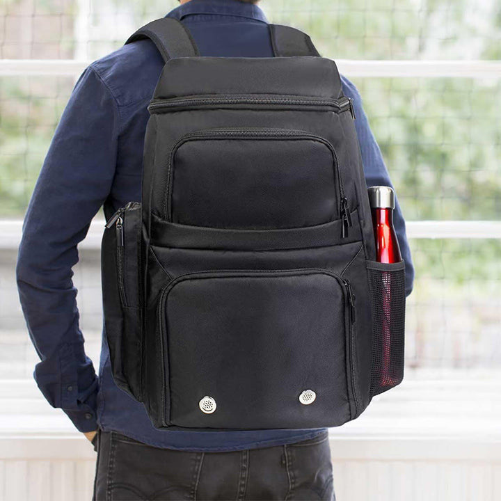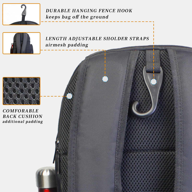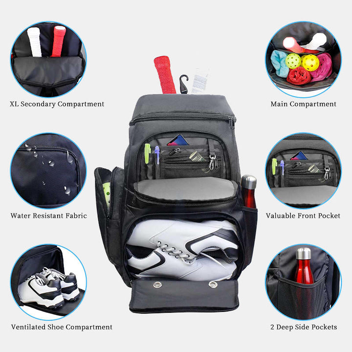 Innenaufteilung: 1 Hauptfach, 1 Innenfach, 1 Schlägerfach, 1 Schuhfach, 1 Vordertasche mit mehreren Fächern, 2 Seitentaschen