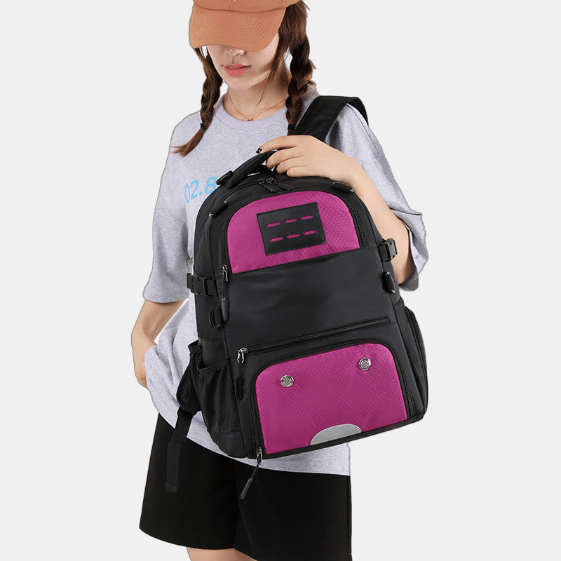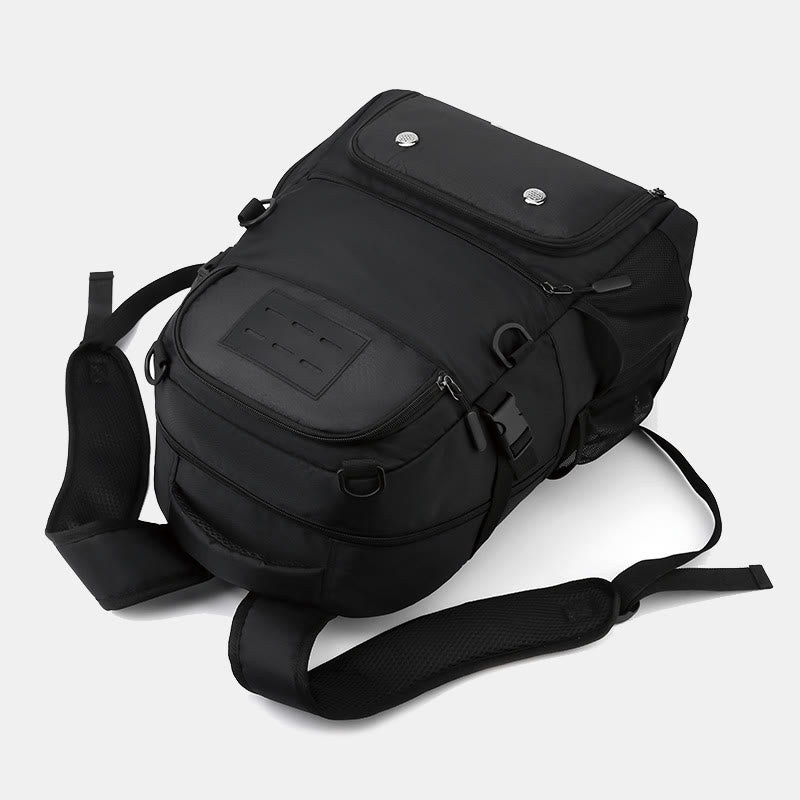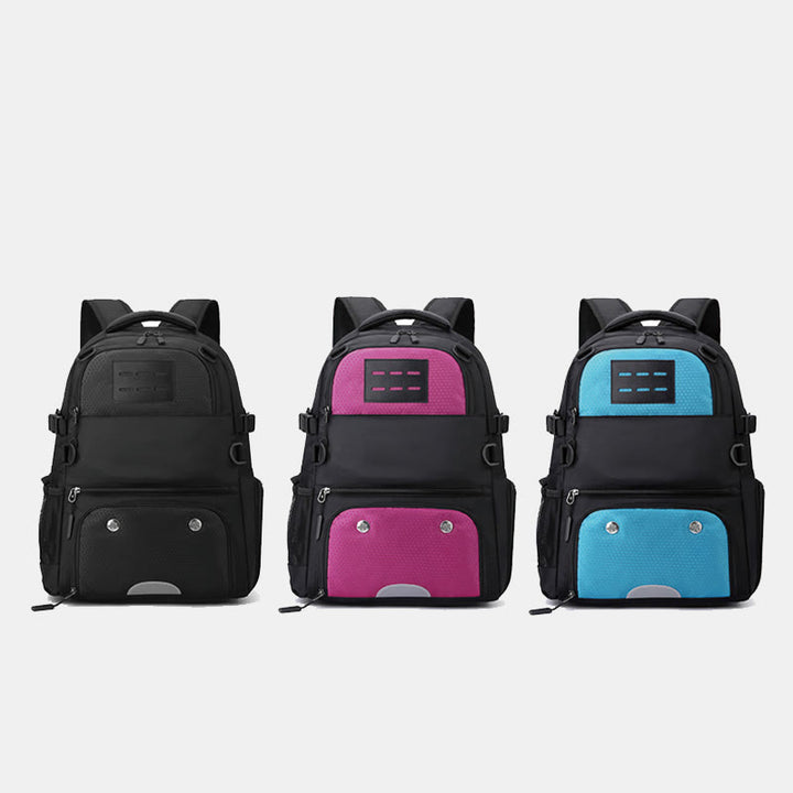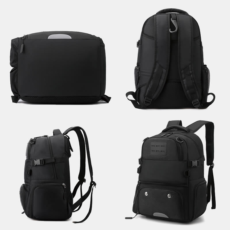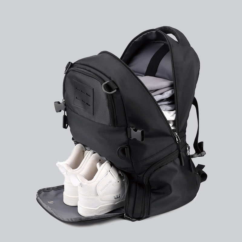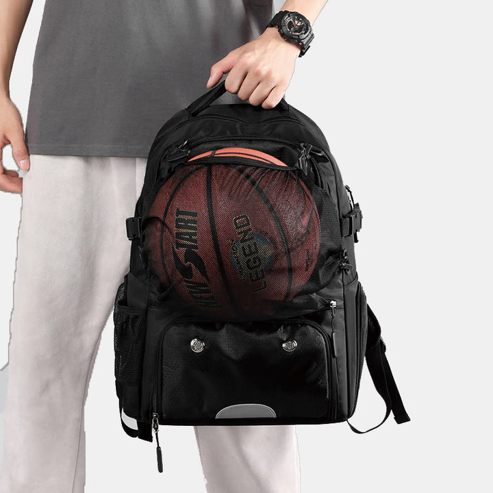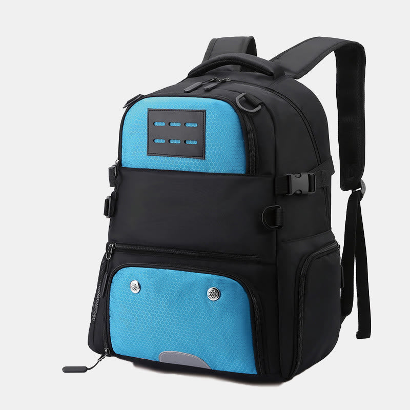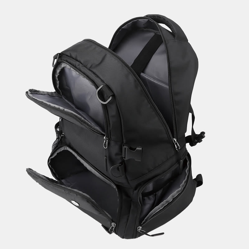 Innenausstattung: 1 Hauptfach, 1 Laptop-Innenfach, 1 aufgesetzte Innentasche, 1 faltbare Ballaufbewahrungstasche, 1 Schuhfach, 1 Reißverschlusstasche vorne, 2 Seitentaschen