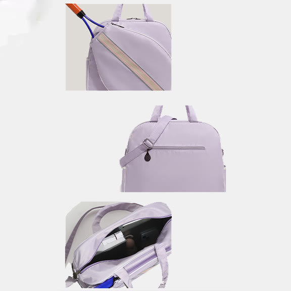 Interne Struktur: 1 Haupttasche, 1 aufgesetzte Innentasche, 2 Seitentaschen, 1 Schlägerhülle, 1 Gesäßtasche