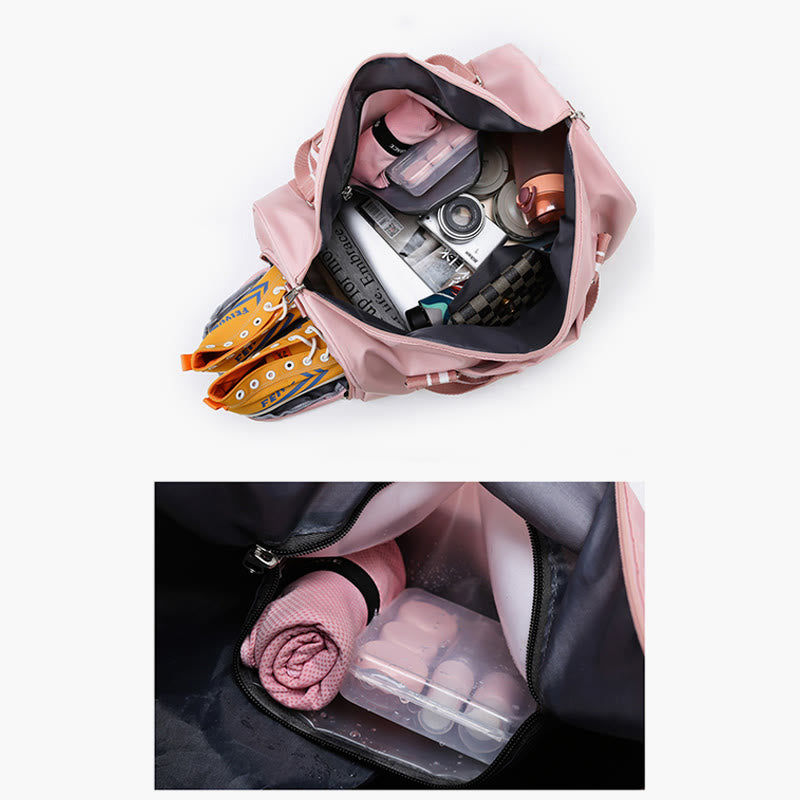 Innenaufteilung: 1 Haupttasche, 1 Trocken-/Nasstrenntasche, 1 aufgesetzte Innentasche, 1 Seitentasche, 1 Gesäßtasche