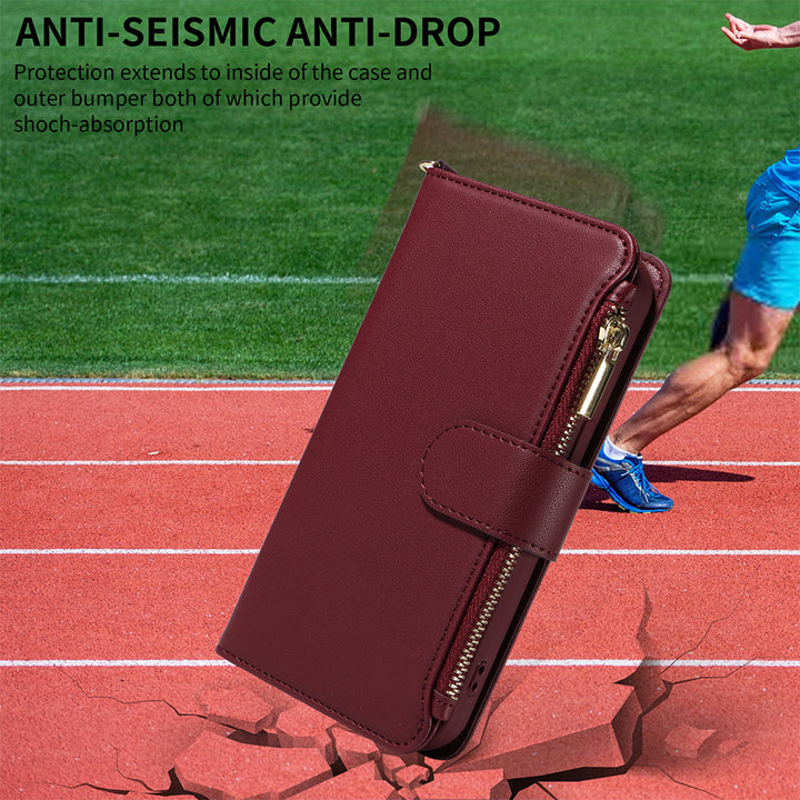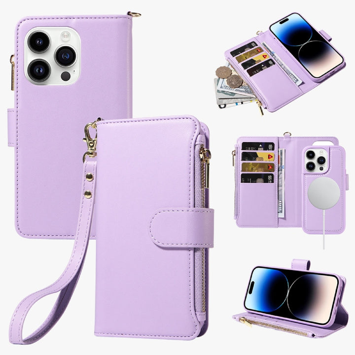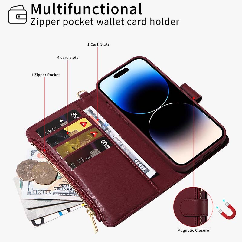 Interne Struktur: 1 Telefonhülle, 4 Kartenfächer, 1 Geldscheinfach, 1 Reißverschlussfach