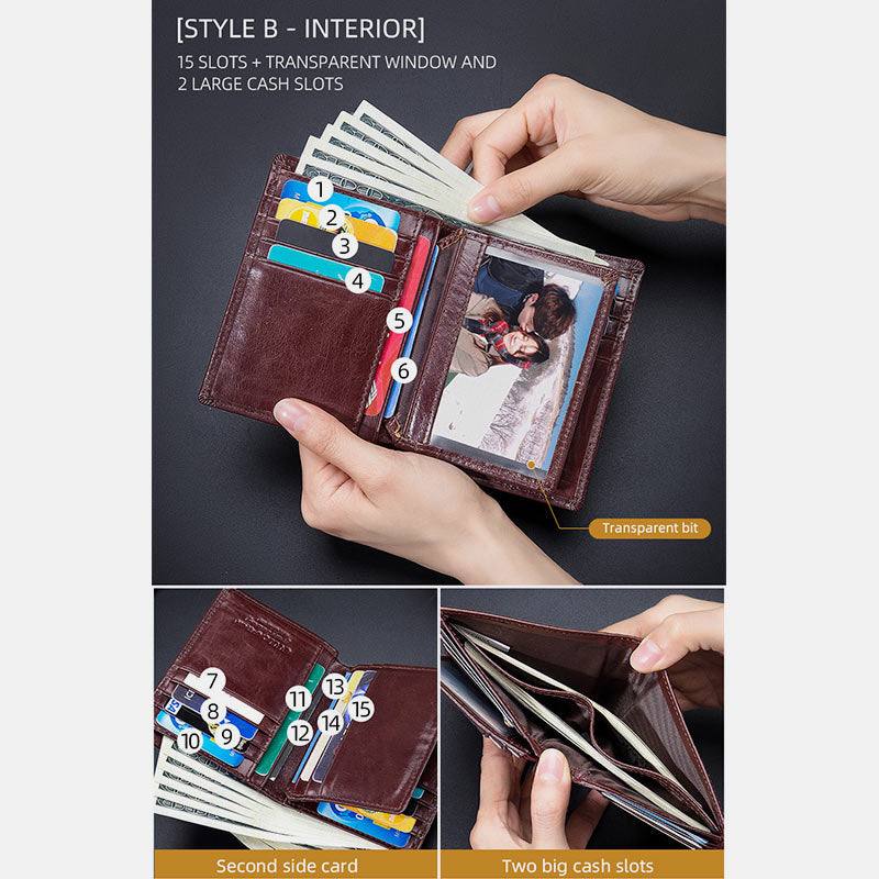 Vertikal: 2 Geldscheinfächer, 15 Kartenfächer, 1 Fotofenster